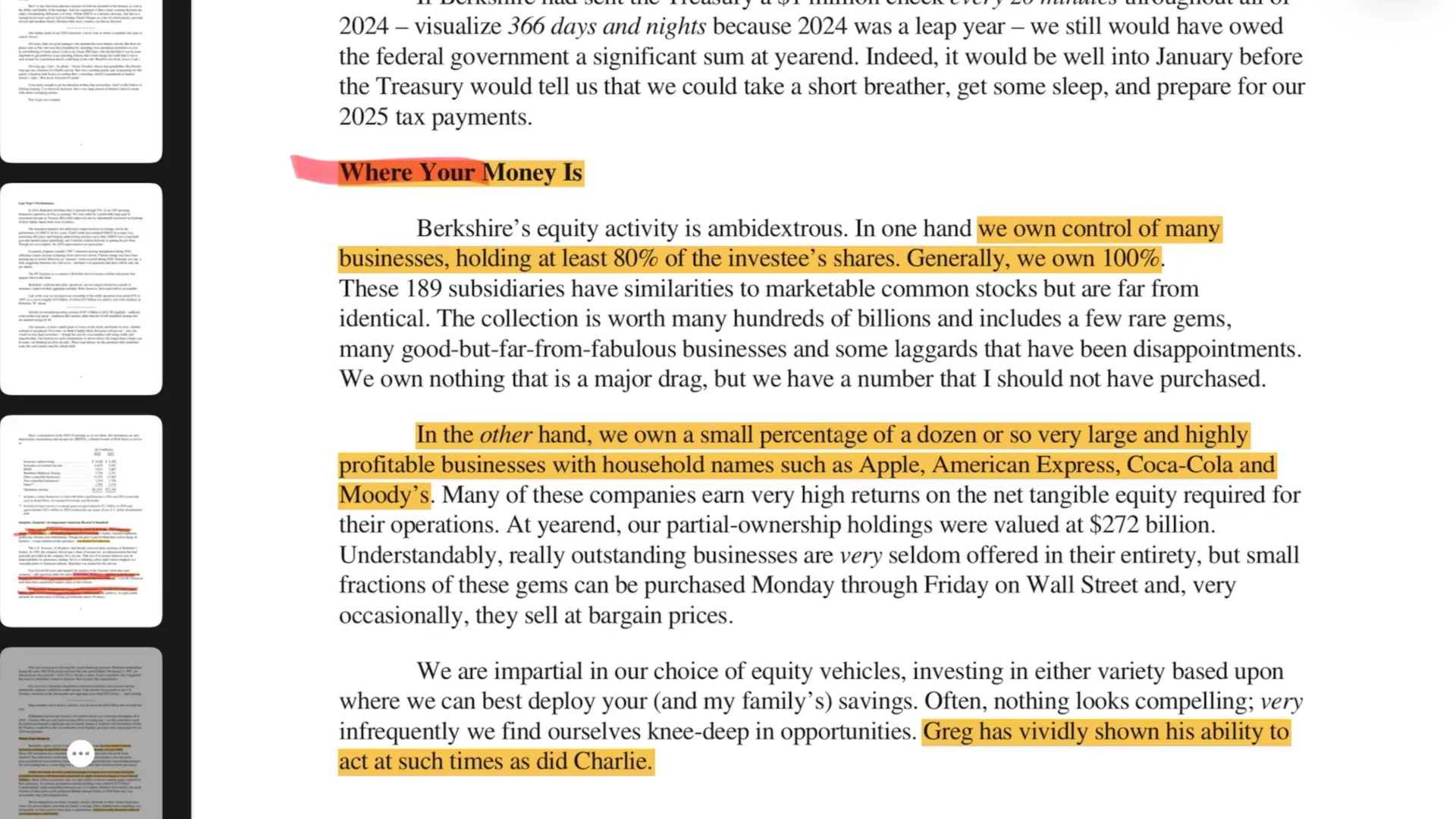 באפט פונה למשקיעים ושואל: "איפה הכסף שלכם?" הוא מדגיש את החשיבות של השקעה בעסקים חזקים, ולא רק בניירות ערך. הוא מסביר כי ברקשייר מחזיקה במניות רבות של חברות מצליחות, וכי הכסף מושקע בעסקים עם פוטנציאל גבוה.